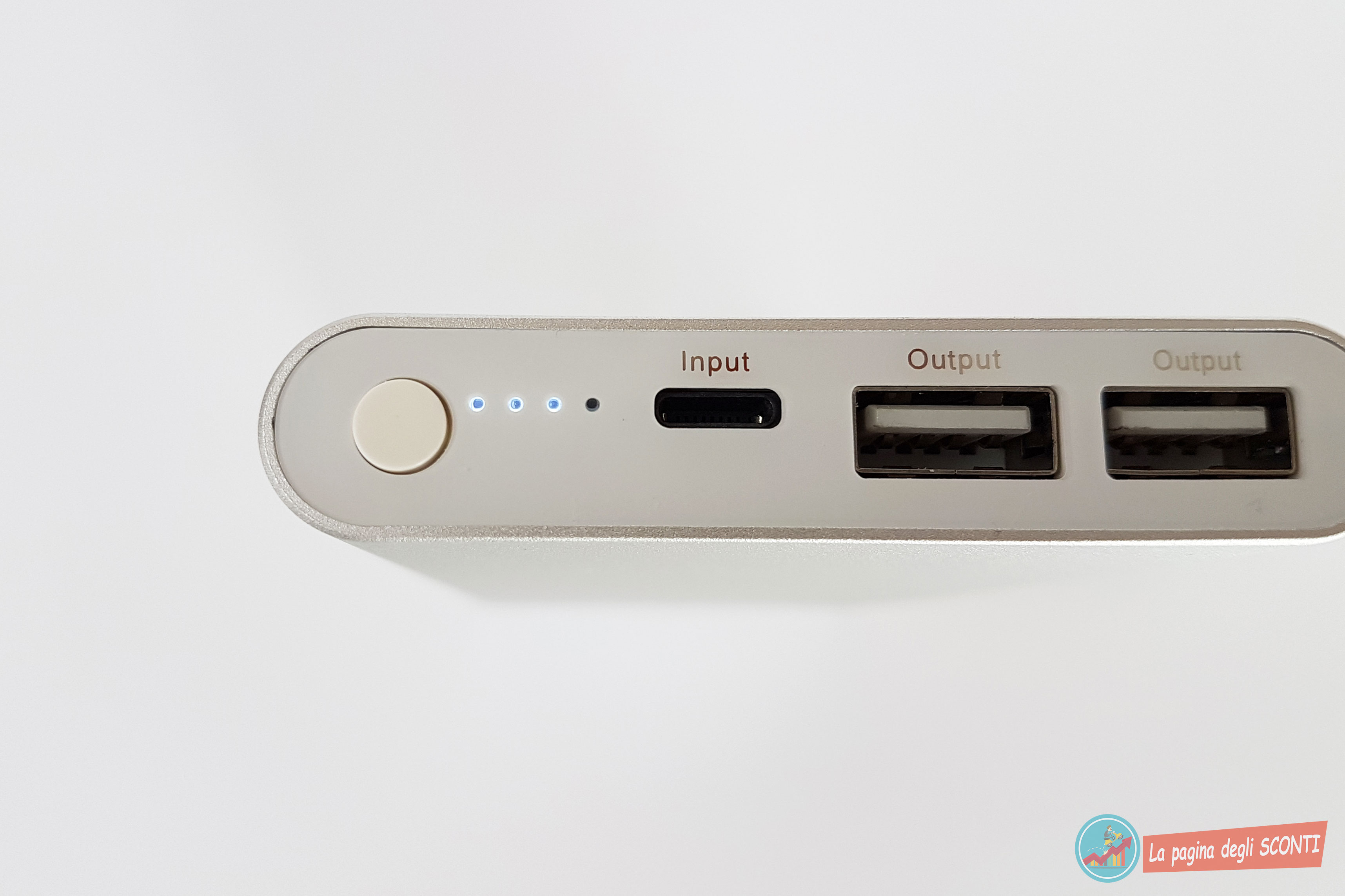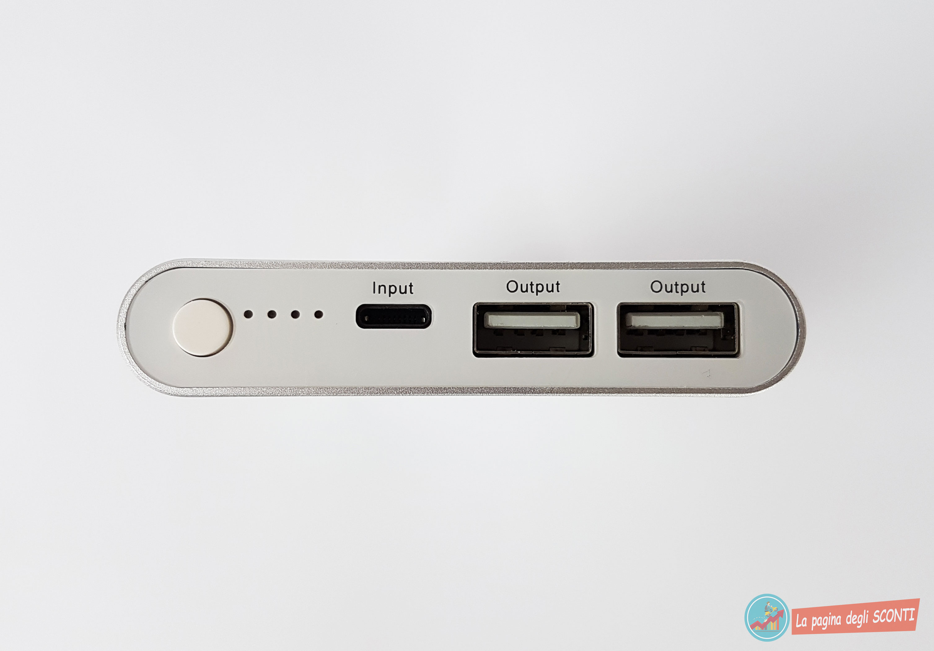 Nella parte frontale troviamo un pulsante che permette di avviare la carica del device collegato e di visualizzare la carica residua del power bank mediante 4 LED.