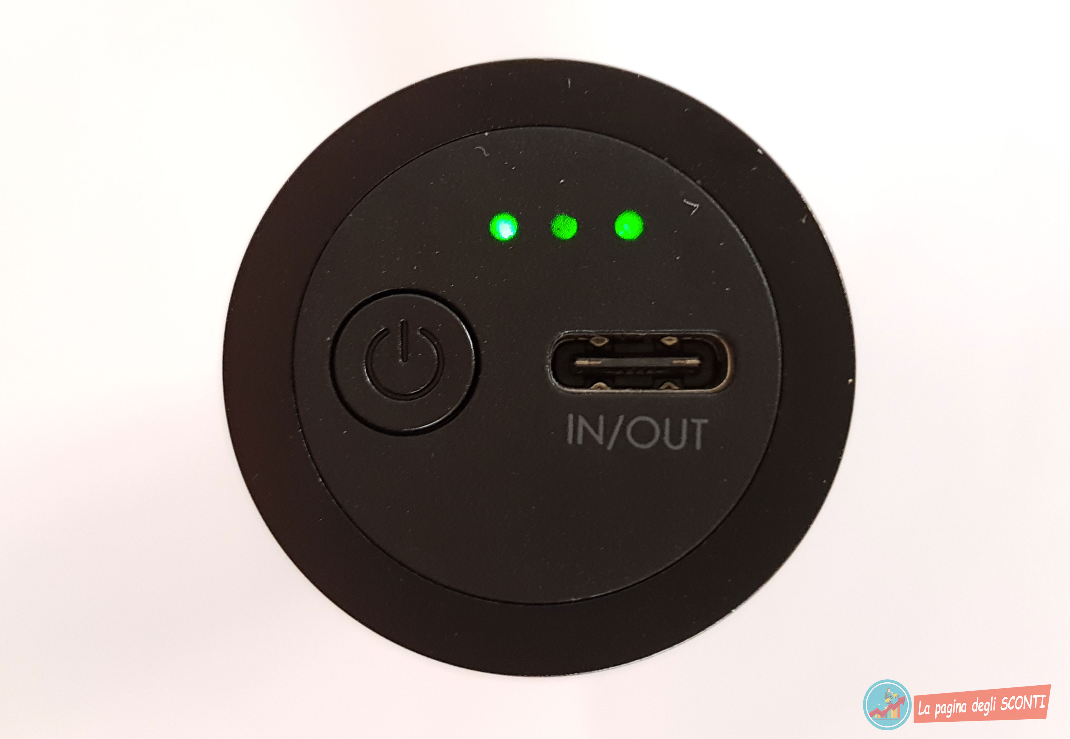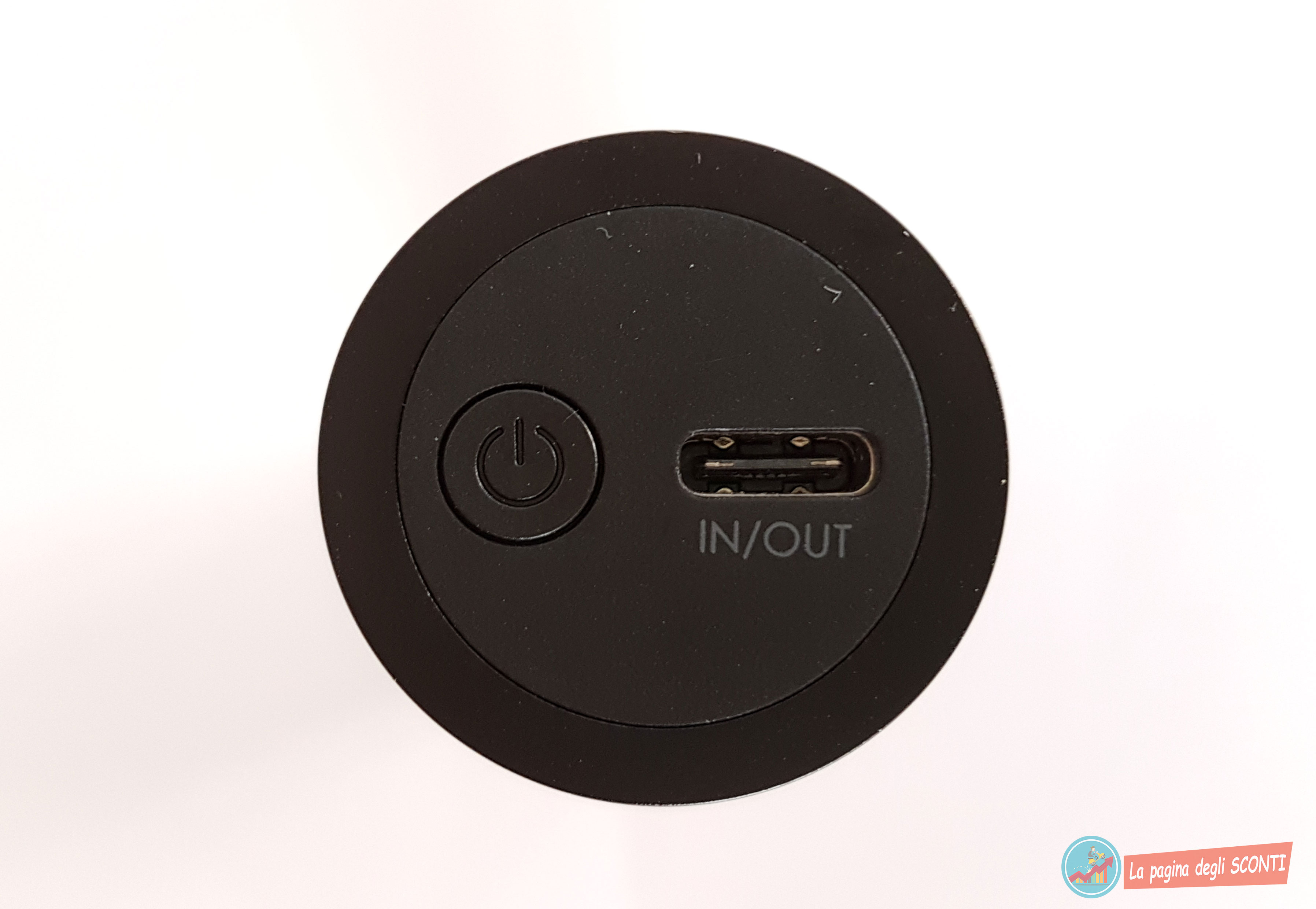 Sulla parte superiore dell’articolo troviamo un ingresso Type-C per la ricarica dei nostri dispositivi ed un tasto power che oltre ad avviare la carica dei device collegati, ci permetterà di monitorare lo stato di carica residua all’interno del power bank.