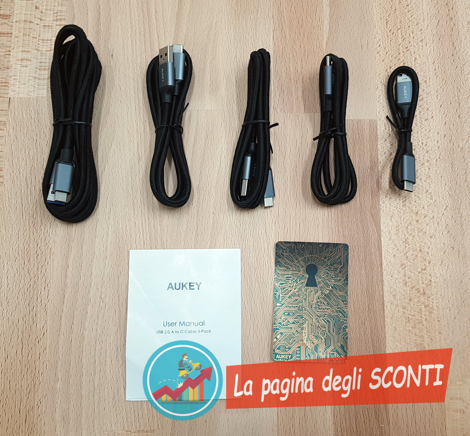 La confezione di vendita si presenta come sempre molto minimale. Infatti, oltre ai 5 cavi AUKEY Type-C a Nylon Intrecciato di lunghezza diversa, troviamo un manuale d’uso e la garanzia di 24 mesi.