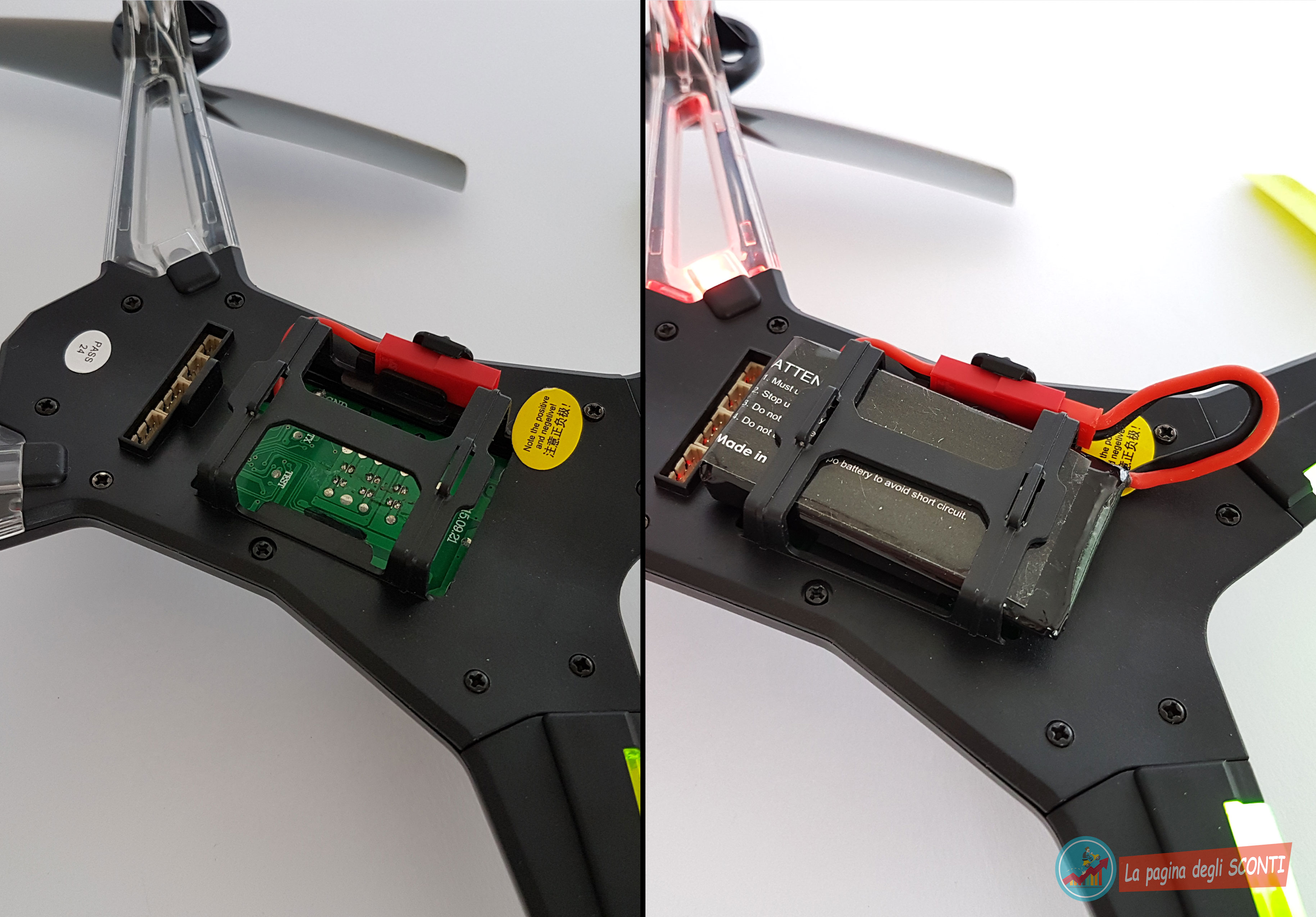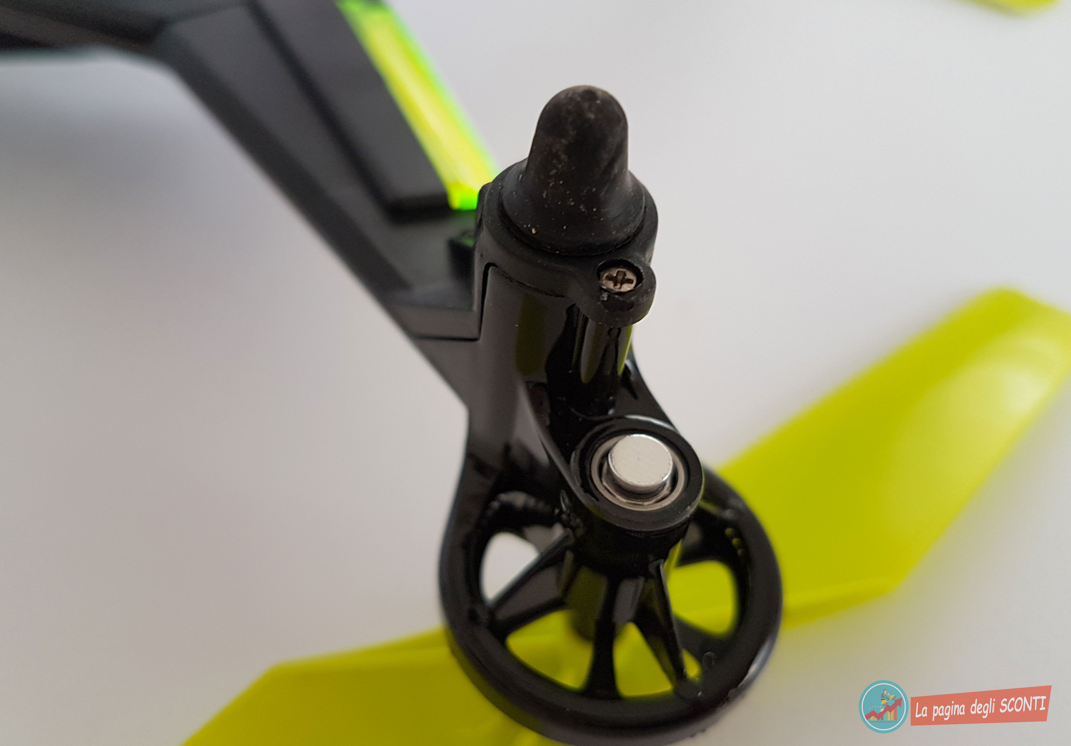 Sotto ogni elica vi sono anche dei gommini che permettono di attutire eventuali atterraggi bruschi, questo salverà in parecchie occasioni la vita del vostro quadricottero.