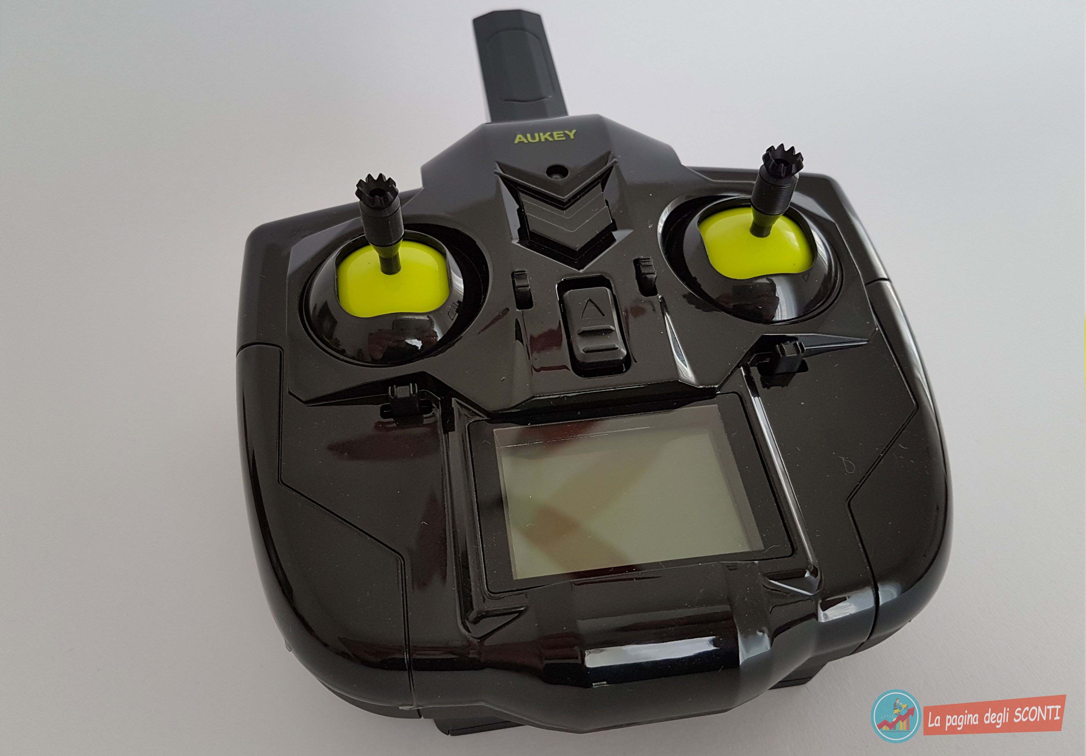 Frontalmente oltre agli analogici e i vari tasti, troviamo un piccolo display che ci fornirà diversi dati come la percentuale di batteria, l’altezza di volo e tanti altri parametri molto interessanti per i più smanettoni.