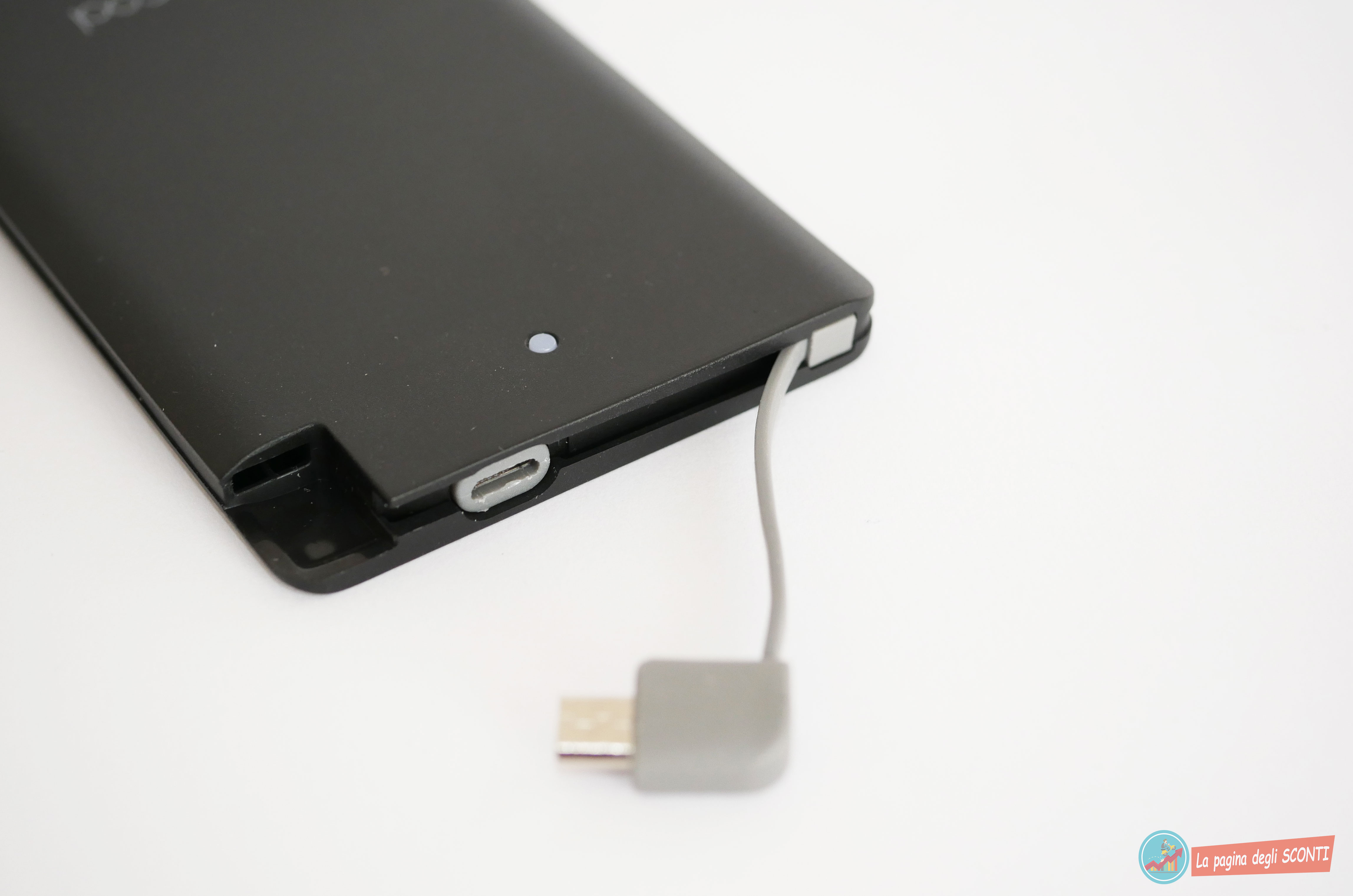 Per ricaricare la batteria portatile troviamo un ingresso microUSB nella parte laterale e occorrerà utilizzare necessariamente il cavetto presente in confezione, o comunque un qualsiasi cavo con standard microUSB-USB.