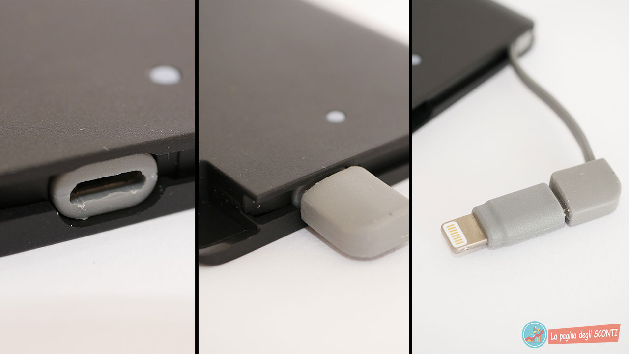 Questa batteria portatile differentemente da molte altre non possiede ingressi USB per collegare i nostri dispositivi, questo perché troviamo già un cavo incorporato nella scocca che potremmo utilizzare ogni volta che ne avremo bisogno. La lunghezza non è molta, si tratta di soli 5 cm che tuttavia sono più che sufficienti.