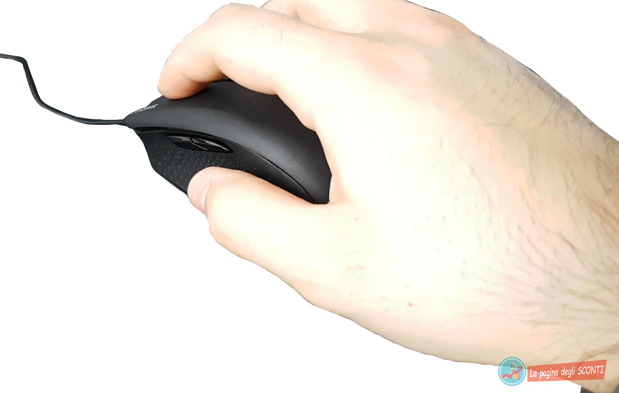 Abbiamo trovato molto gradevole la plastica presente sul dorso del mouse, essendo ruvida, in accoppiata ai due lati gommati conferisce un grip molto elevato.