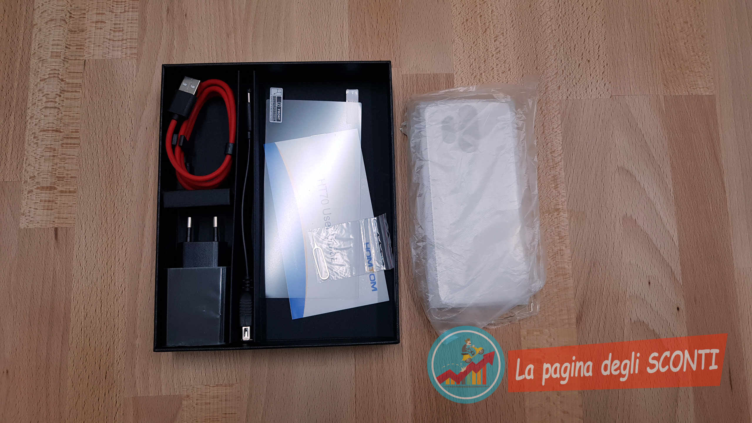 La confezione di vendita presenta, oltre al phablet HOMTOM HT70, un cavo USB di tipo-C con relativo adattatore da parete, un cavo USB OTG (utile per caricare addirittura altri dispositivi), adattatore jack cuffie 3.5mm, ago per inserire la SIM, 2 pellicole protettive (di cui una già installata) ed una cover trasparente in silicone.