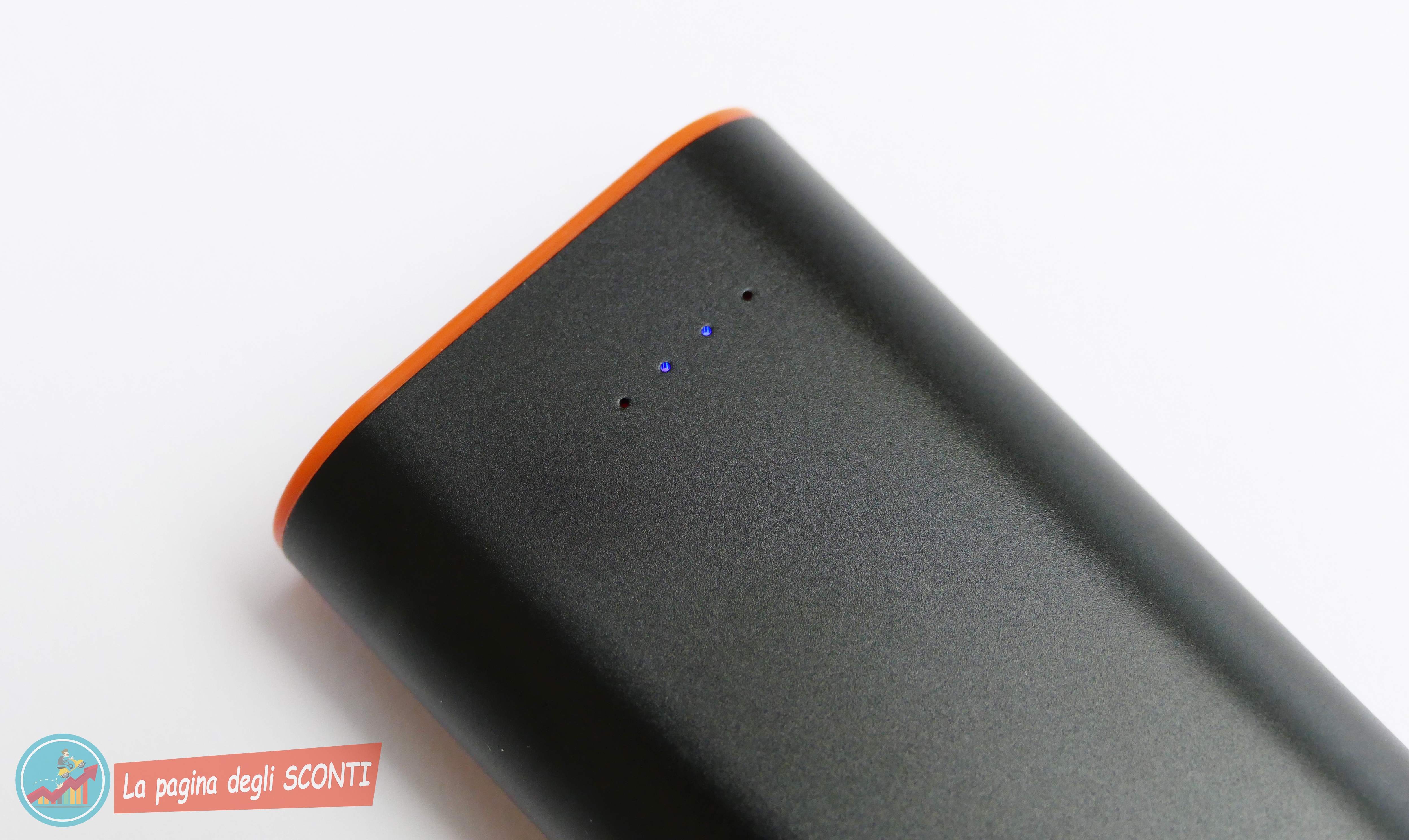 Questa batteria portatile è molto curata esteticamente, infatti ad eccezione della parte superiore e posteriore, il resto è realizzato interamente in alluminio satinato nero. Molto particolari le due bande arancioni poste sulla parte superiore e inferiore.
