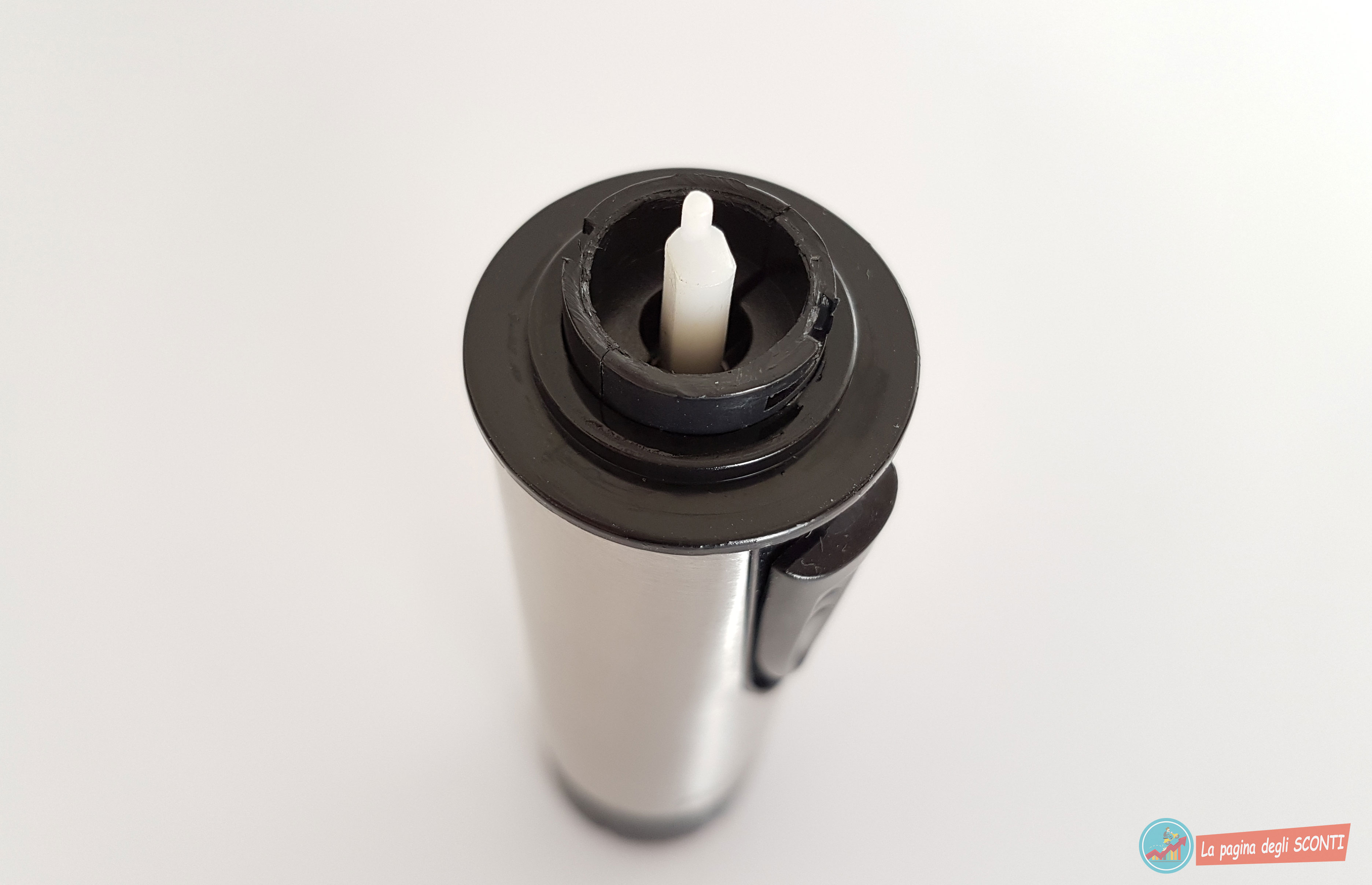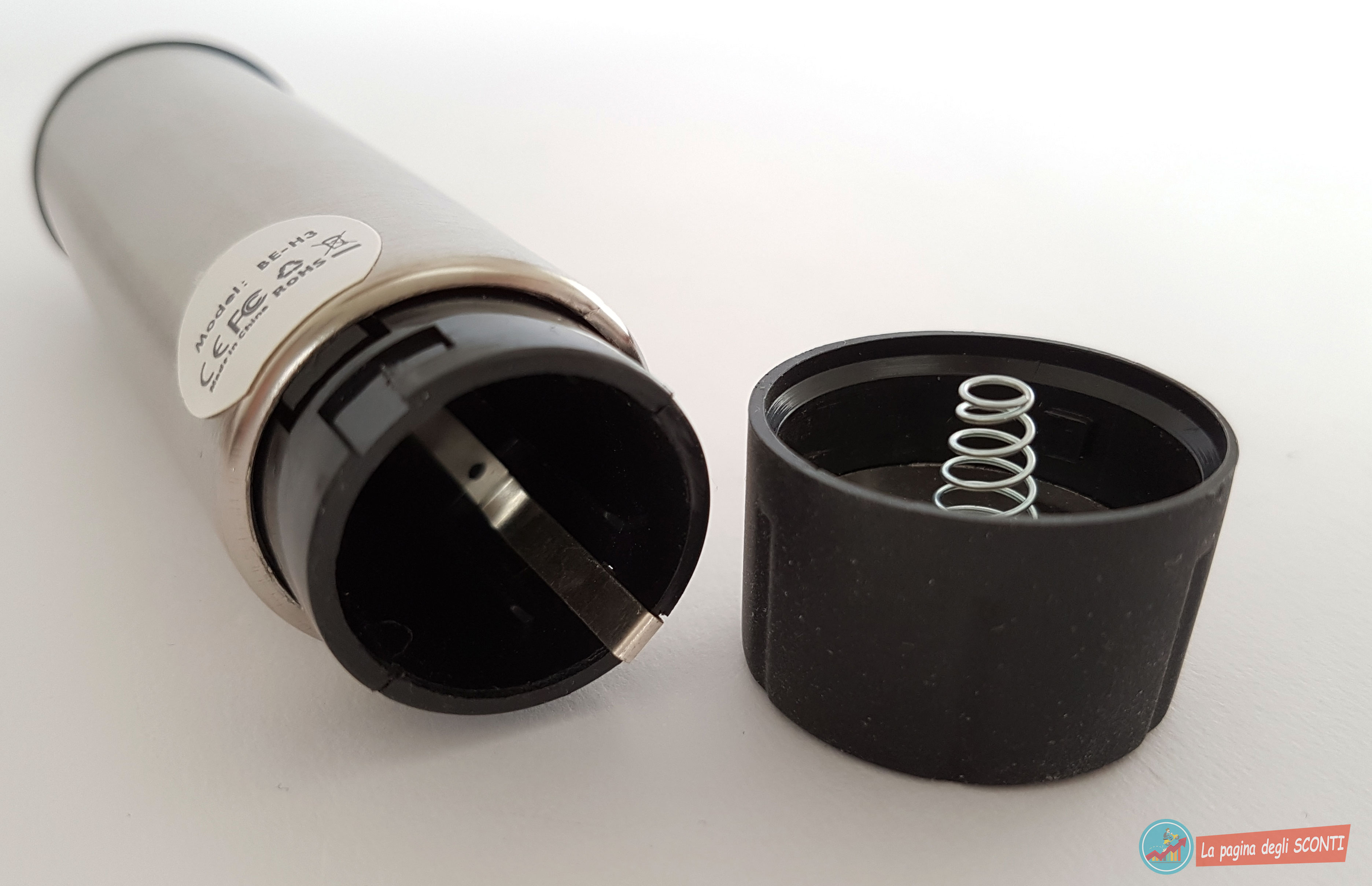 L’alloggio è situato nella parte sottostante, accessibile svitando il tappo presente rivestito in gomma, questo fornisce un’ottimo grip e vi aiuterà in questa operazione.