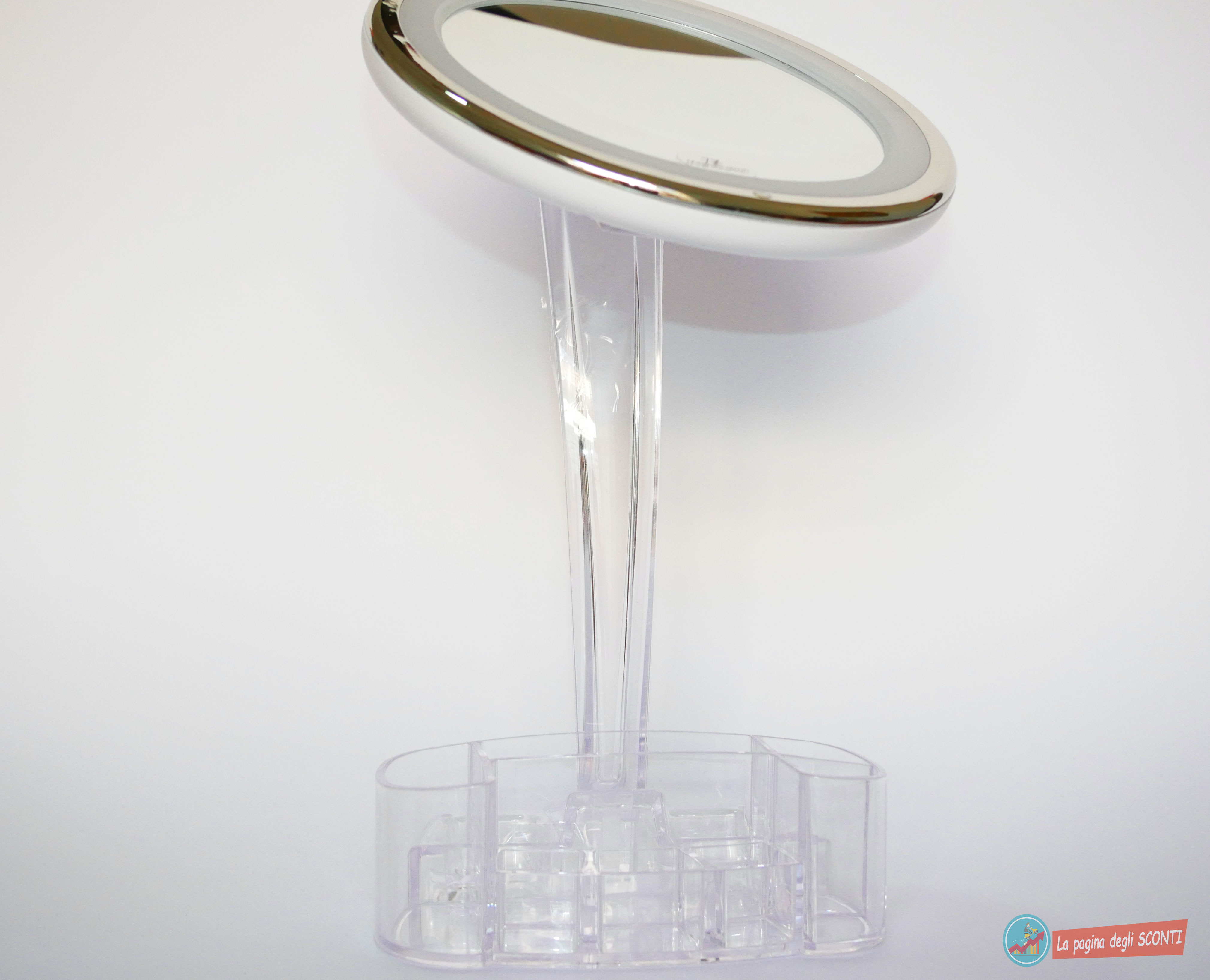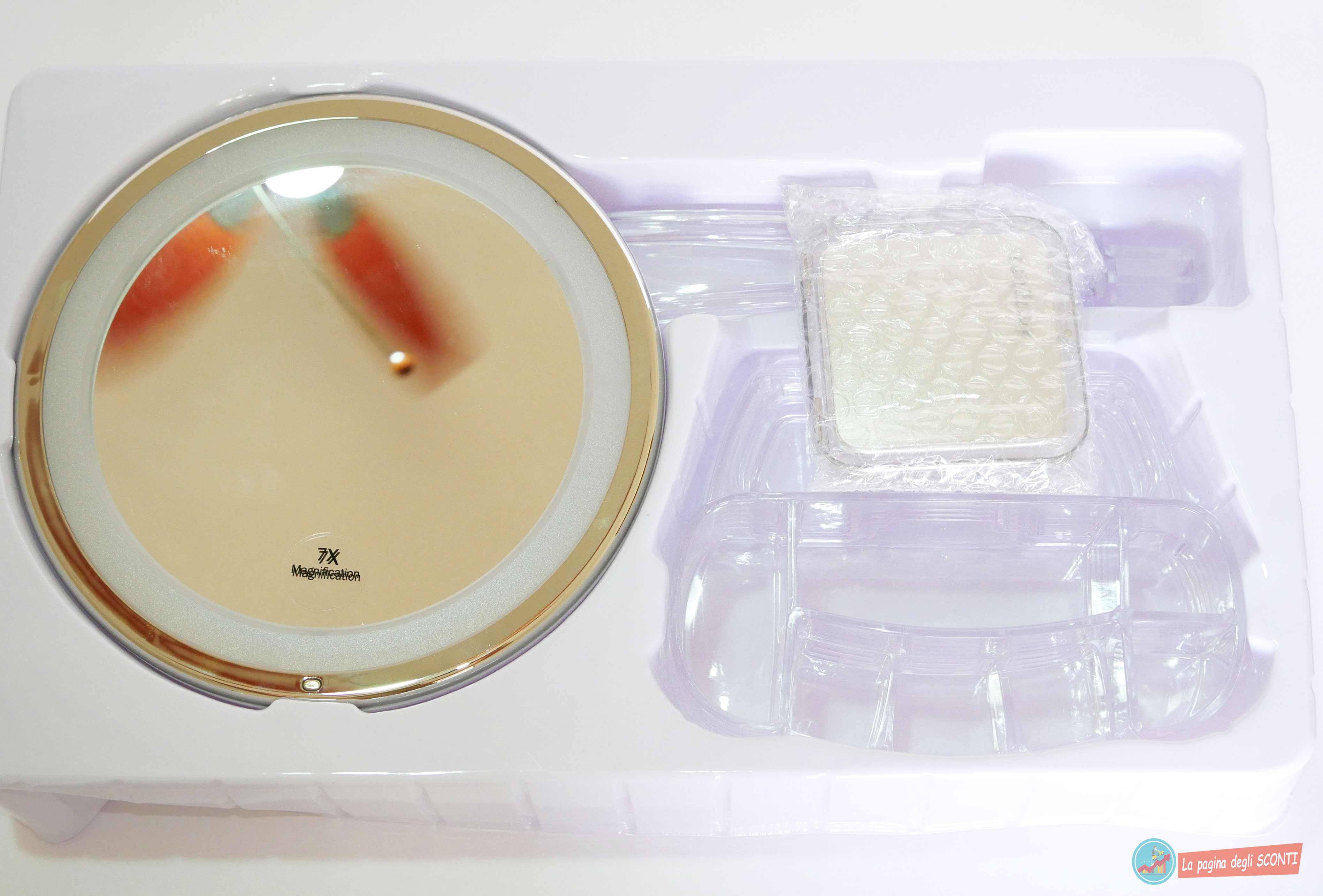La confezione di vendita dell’oggetto contiene molti accessori, per questo risulta piuttosto ingombrante. Al suo interno troviamo: uno specchio 7x con rotazione e LED integrato, una basetta poggia trucchi ed uno specchietto portatile.