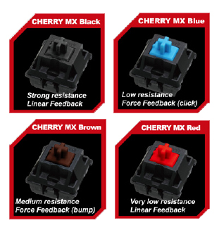 Gli switch in circolazione sono molti e differiscono fra loro per colorazione e conseguentemente per prestazioni, ci sono quelli più adatti per la scrittura (cherry blu), quelli più adatti per il gaming (cherry red) e quelli adatti per entrambe le operazioni (cherry brown).