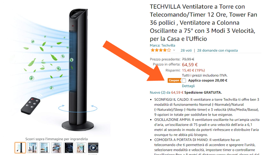 Fino al 25 luglio, il ventilatore Techvilla è in offerta con un doppio sconto del 40%: spunta la casella di sconto e pagherai soltanto 44,59 euro un prodotto di ben altra fascia!