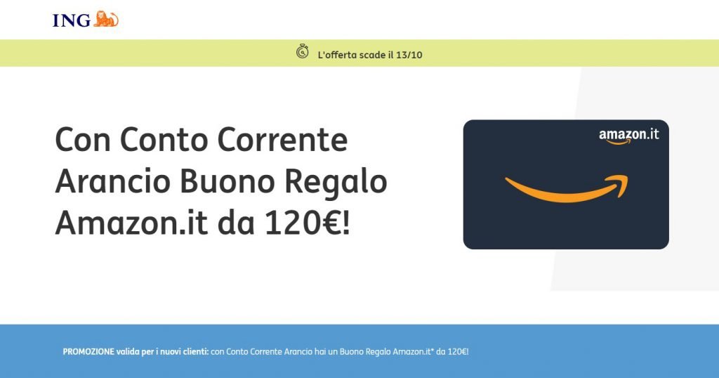 Arriva un’ottima occasione per aprire un conto corrente: ci riferiamo al Conto Arancio di ING Bank, che fino al 13 ottobre regala ai nuovi clienti un buono regalo Amazon da ben 120€!