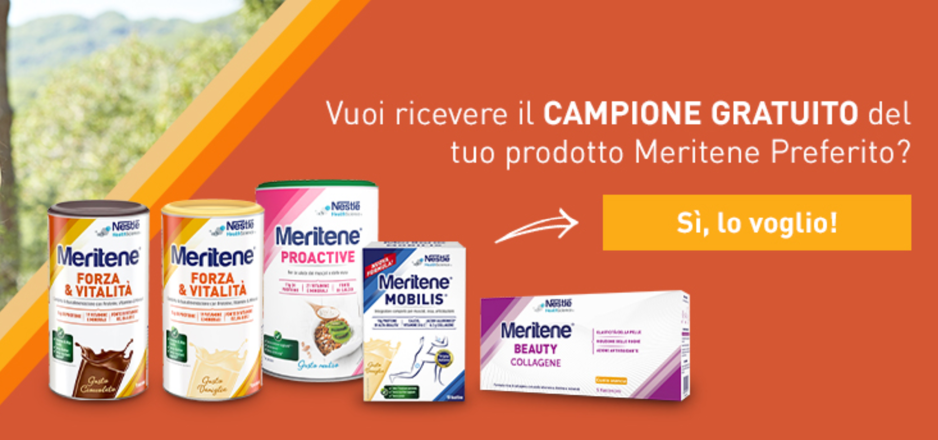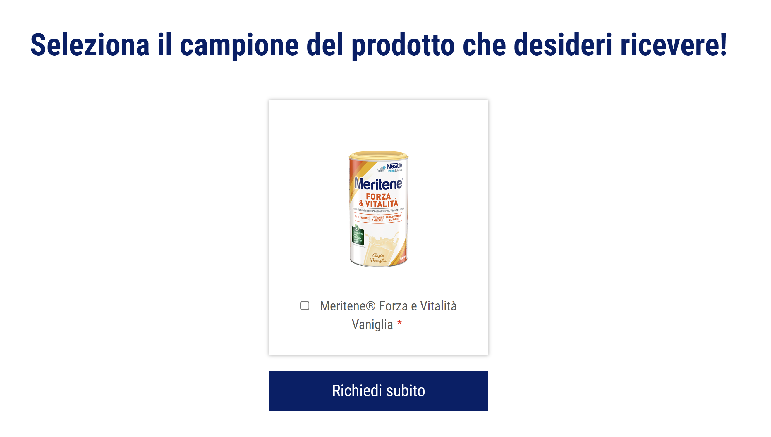 Seleziona Meritene Forza e Vitalità Vaniglia (l’unico selezionabile) e richiedi subito il tuo campione omaggio!