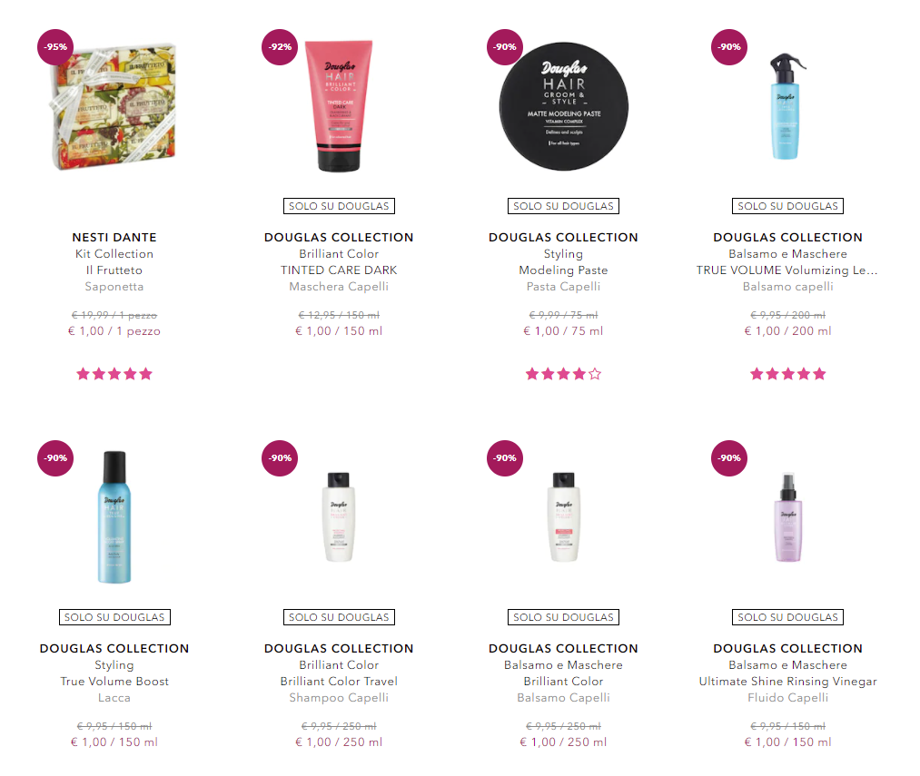 Douglas offre una serie di promozioni, tra cui saldi fino al 95% su tanti prodotti, a partire da solo 1€!