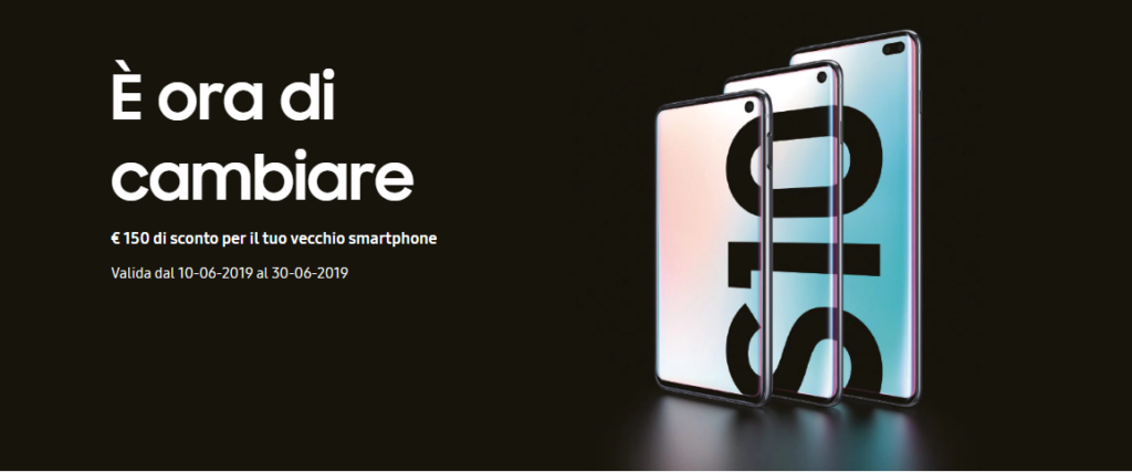Con la promo “È ora di cambiare” di Samsung, ricevi uno sconto di 150€ sull’acquisto di un Galaxy S10e/S10/S10+, rottamando il tuo vecchio smartphone (anche non funzionante)!