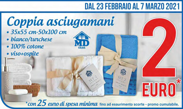 MD ti offre la possibilità di acquistare a soli 2€ un set coppia di asciugamani!