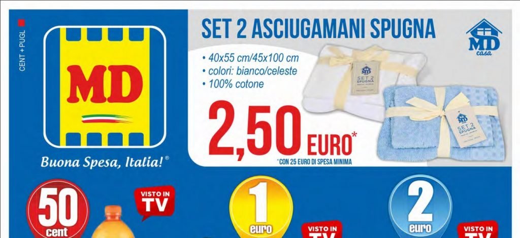 Recati in cassa e, con 25,00€ di spesa raggiunta e salvo esaurimento scorte, l’addetto alla cassa del discount MD provvederà a venderti il set con un supplemento di 2,50€!