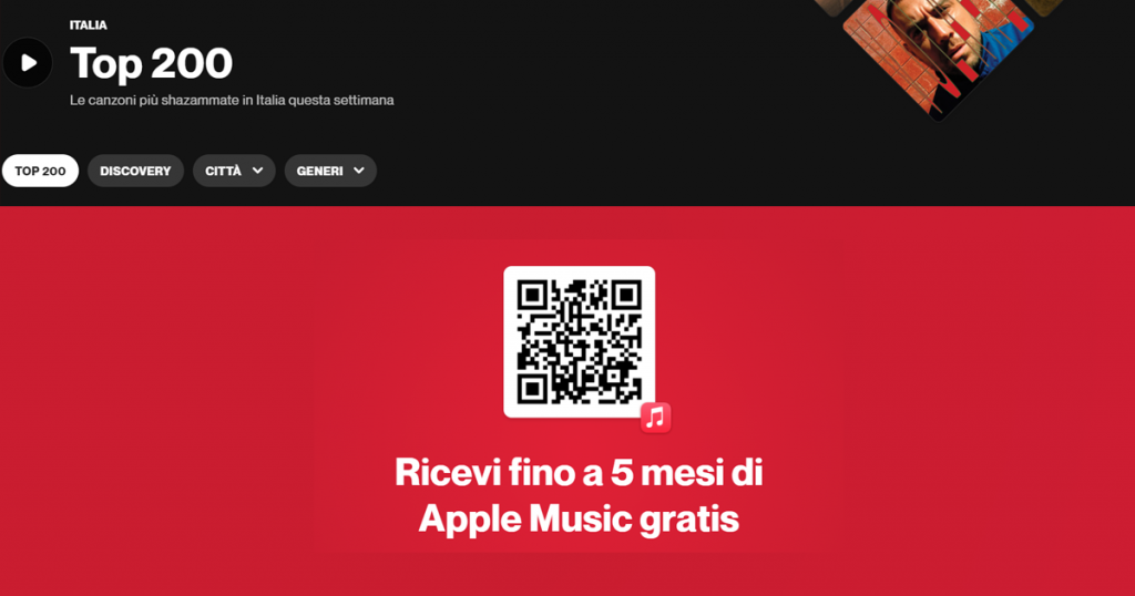 Per celebrare la classifica delle canzoni più shazammate del 2021, Shazam offre fino a 5 mesi gratuiti di Apple Music per tutti i nuovi utenti. E per approfittare di quest’offerta basta semplicemente andare sul sito di Shazam Apple Music, inquadrare il codice QR e riscattare i mesi gratuiti (se disponibili).