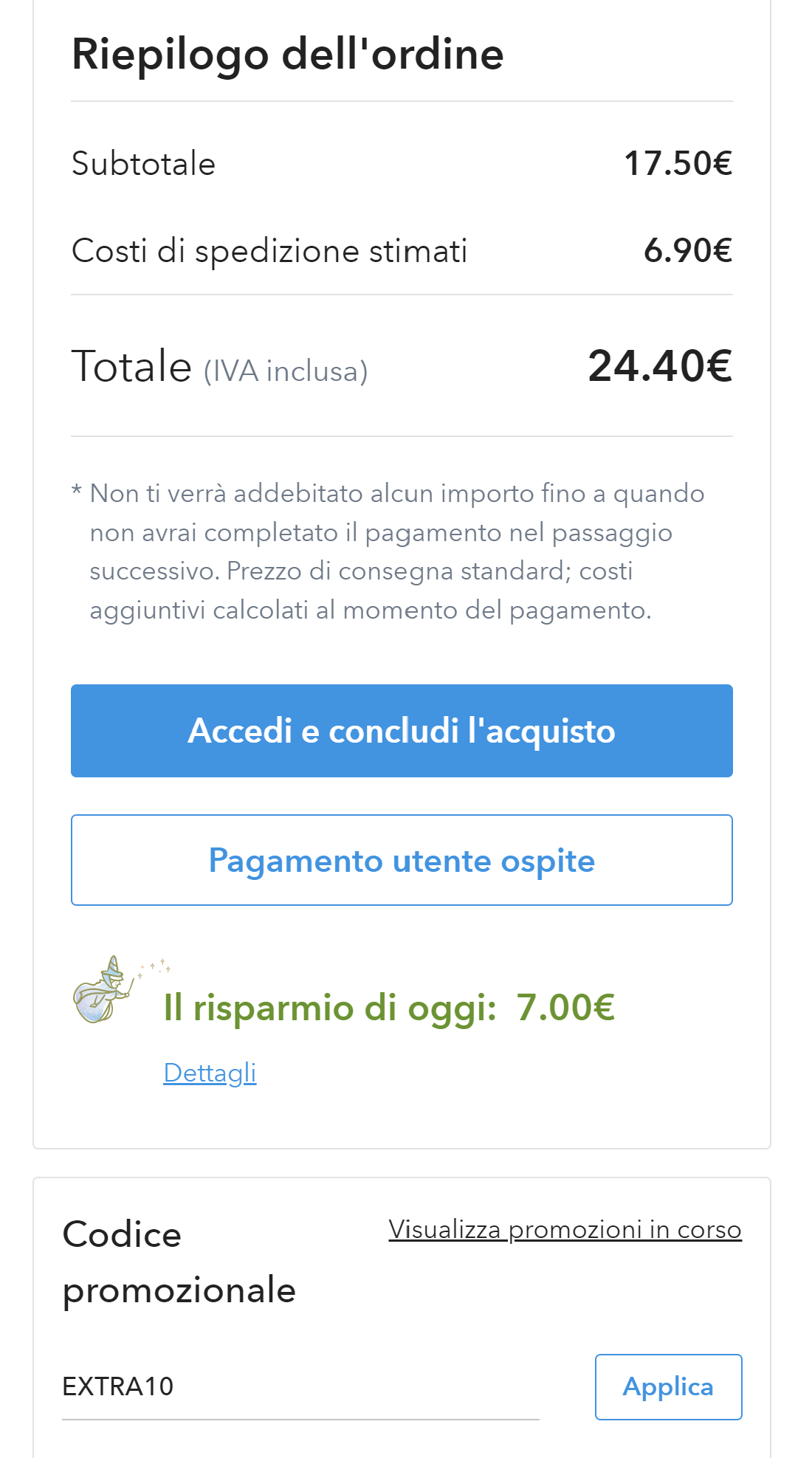 Clicca dunque sul pulsante “Accedi e concludi acquisto” (se vuoi anche registrare un account/effettuare il login) o “Pagamento utente ospite” (se vuoi evitare di registrarti al sito) e compila i campi richiesti per completare l’ordine!