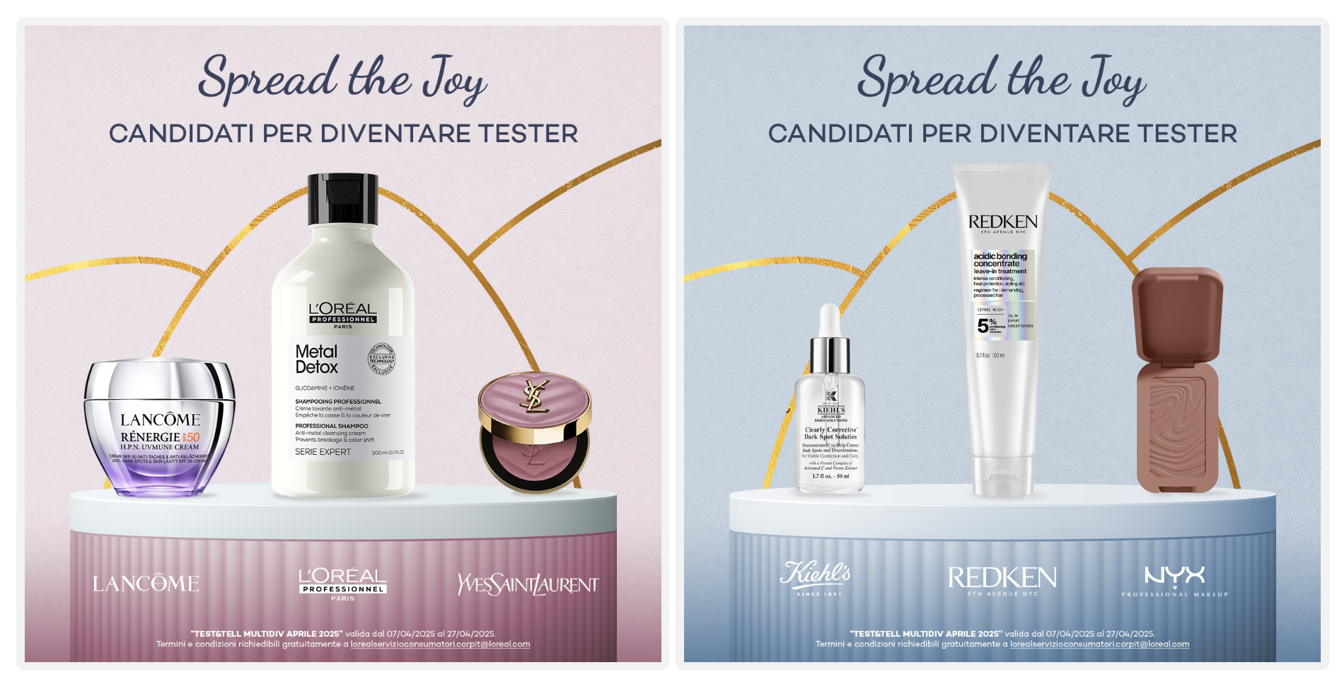 Sei sempre alla ricerca di nuovi prodotti da provare per migliorare e integrare il tuo make-up e la cura di corpo e capelli? Allora approfitta dell’iniziativa di L’Oreal Paris “Spread the joy” e prova a diventare tester per provare gratis una delle 2 Beauty Box di Aprile disponibili, con all’interno prodotti di brand del calibro di Redken, Kiehl’s, Lancôme, L’Oréal Professionnel, Yves Saint Laurent e NYX Professional.