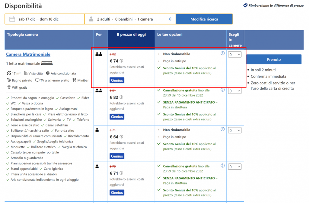 Esempio di offerta su Booking