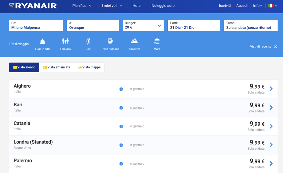Prezzi bomba su Ryanair: tantissimi voli in offerta a 9,99€ o comunque sotto ai 20€!