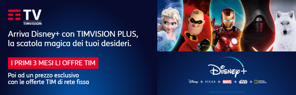TIM lancia una promozione davvero interessante per tutti gli utenti che hanno già attiva un’offerta di linea fissa internet: Disney+ e TIMVISION PLUS a soli 3€ al mese con i primi 3 mesi GRATIS!