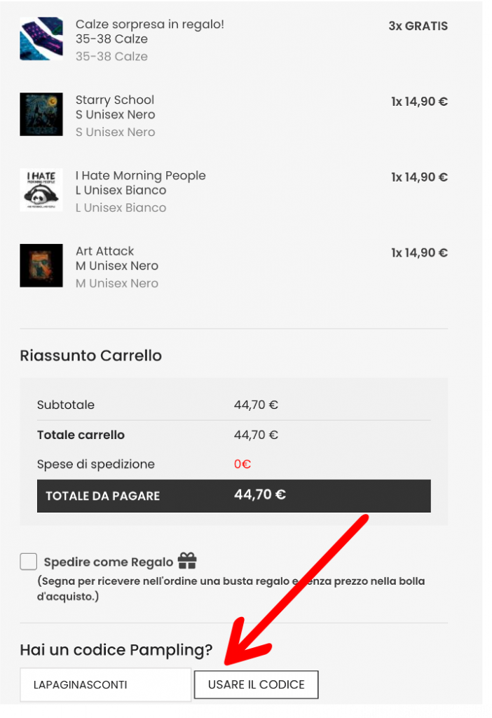 La foto di seguito ti mostra dove inserire il codice sconto LAPAGINASCONTI per assicurarvi le calze in omaggio con la vostra spesa di magliette Pampling.