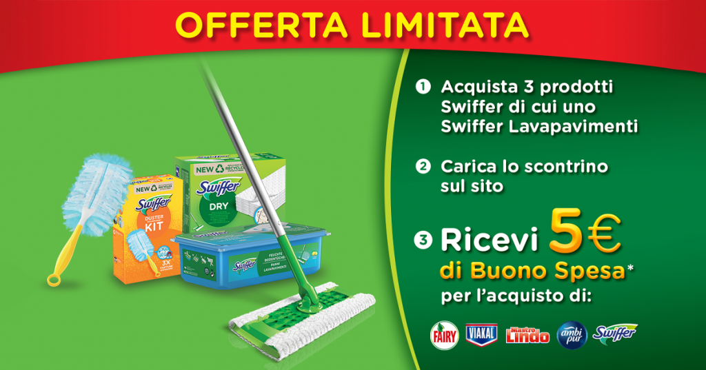 Per attivare la promozione, devi invece acquistare 3 prodotti Swiffer a tua scelta e una scopa Swiffer lavapavimenti.