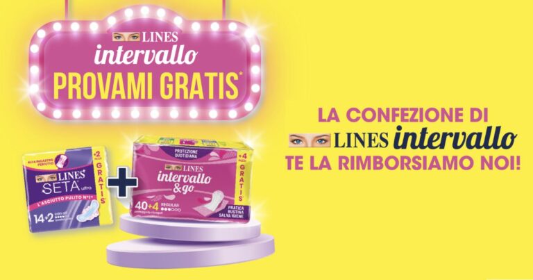 Partecipa all’iniziativa cashback “Lines Intervallo – Provami Gratis”: il 100% di rimborso dell’importo speso per una confezione di Lines Intervallo, fino a un massimo di 5,50€! Prodotti in promozione Per poter richiedere correttamente il cashback dovrai acquistare, in un unico scontrino, 1 confezione di Lines Seta…