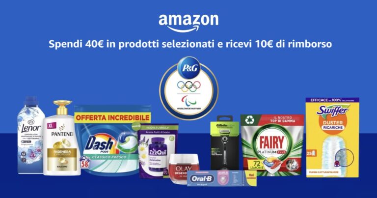 Acquistando su Amazon almeno 40€ di prodotti P&G, ottieni subito un buono sconto di 10€, spendibile anche durante il Prime Day 2025!