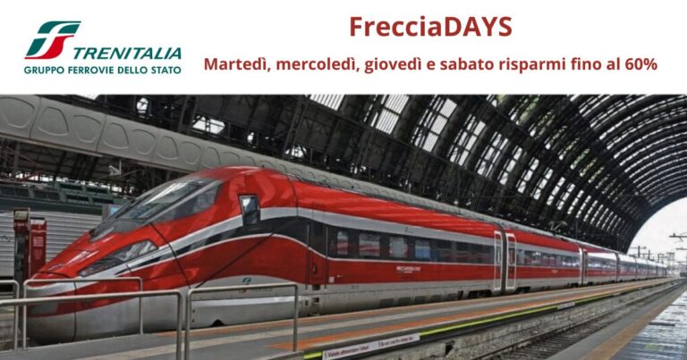 Approfitta dell'offerta FrecciaDAYS di Trenitalia: il martedì, il mercoledì, il giovedì e il sabato viaggi sui treni Frecciarossa e Frecciargento con sconti fino al 60%!