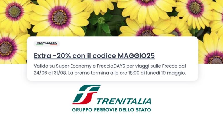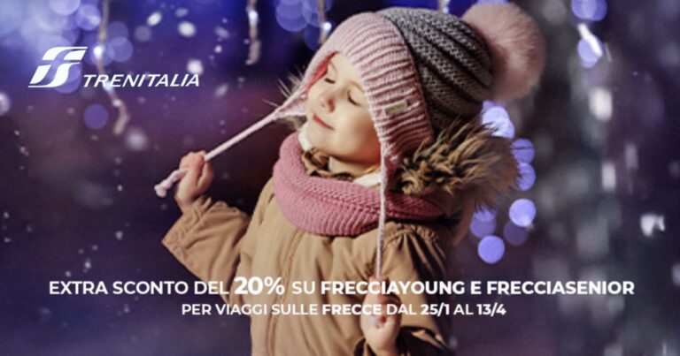 Approfitta del nuovo codice promo di Trenitalia dedicato a soci FrecciaYOUNG e FrecciaSENIOR, attivo solo fino a domani, che ti offre il 20% di extra sconto per viaggi sui treni Frecciarossa e Frecciargento!