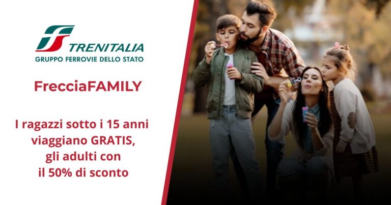 Risparmia sul tuo viaggio in famiglia! Grazie all'offerta FrecciaFAMILY di Trenitalia i ragazzi sotto i 15 anni viaggiano gratis sulle Frecce, mentre gli adulti pagano metà prezzo!