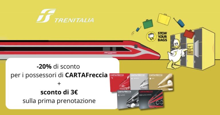 Non sai dove lasciare i bagagli? Cerca un deposito su Stow Your Bags e ottieni il 20% di sconto con la tua CartaFRECCIA. Inoltre, per il tuo primo utilizzo, ti verrà riconosciuto un ulteriore sconto di 3€ su una spesa minima di 6€.