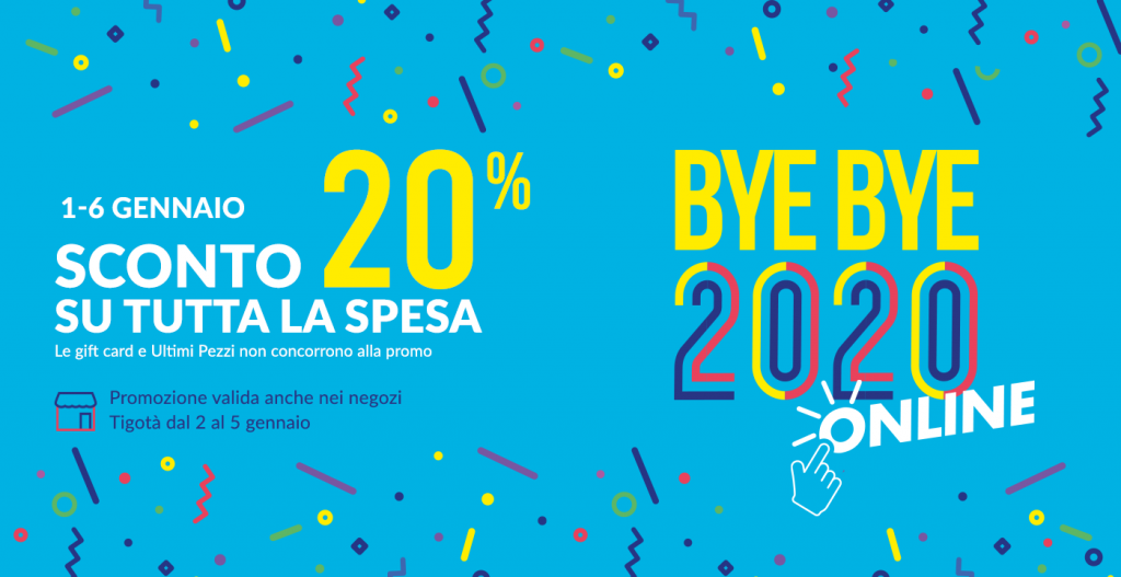 Fino al 6 gennaio 2021, Tigotà saluta lo scorso anno con “Bye Bye 2020” e ti offre uno sconto pari al 20% su tutta la tua spesa!