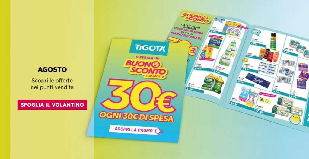 Con il nuovo volantino di agosto di Tigotà, arriva anche un’ottima promozione: ogni 30€ spesi in negozio, ricevi un buono sconto del medesimo valore da utilizzare entro fine mese!