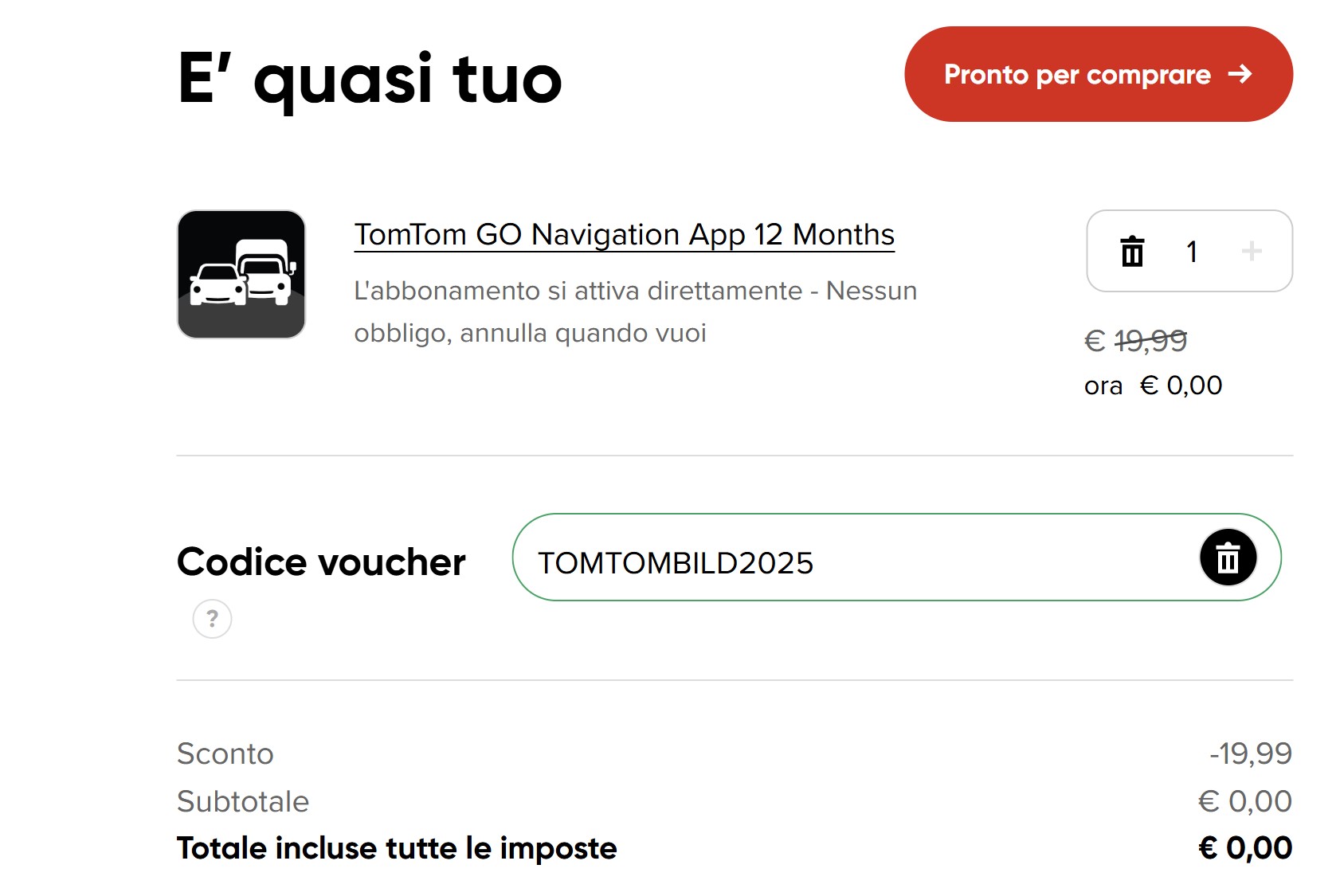 Ti basterà inserire il codice sconto TOMTOMBILD2025 e il conto si azzererà immediatamente nel carrello: l’abbonamento si attiverà direttamente!