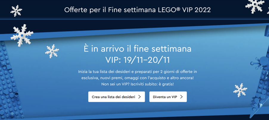 Questo weekend, 19 e 20 novembre, torna il tanto amato Fine settimana VIP di LEGO! Inizia la tua lista dei desideri e preparati per 2 giorni di offerte in esclusiva, nuovi premi, omaggi con l’acquisto e tanto altro ancora!