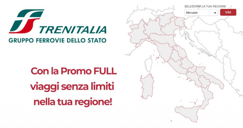 La promo FULL è un titolo di viaggio nominativo, valido per un mese solare, che consente un numero illimitato di viaggi in seconda classe su tutti treni regionali, regionali veloci e metropolitani di Trenitalia all’interno della regione scelta, indipendentemente dall’origine e destinazione del viaggio.