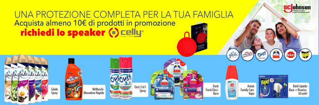 SCJ propone una iniziativa davvero niente male, che ti offre uno speaker portatile Celly in omaggio acquistando prodotti Raid, Oust, Autan, Duck, MrMuscle e/o Glade Spray!