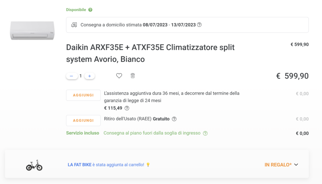 Hai diritto ad ottenere la bike anche se tra il 3 e il 20 luglio 2023 effettuerai la prenotazione di un prodotto che aderisce all’iniziativa con successivo ritiro presso il punto vendita e saldo dell’importo dovuto con conseguente emissione di scontrino. In tal caso, il termine massimo di 180 giorni per la relativa consegna del premio decorrerà dalla data in cui sarà stato prenotato il prodotto e non dalla data di emissione del relativo scontrino.