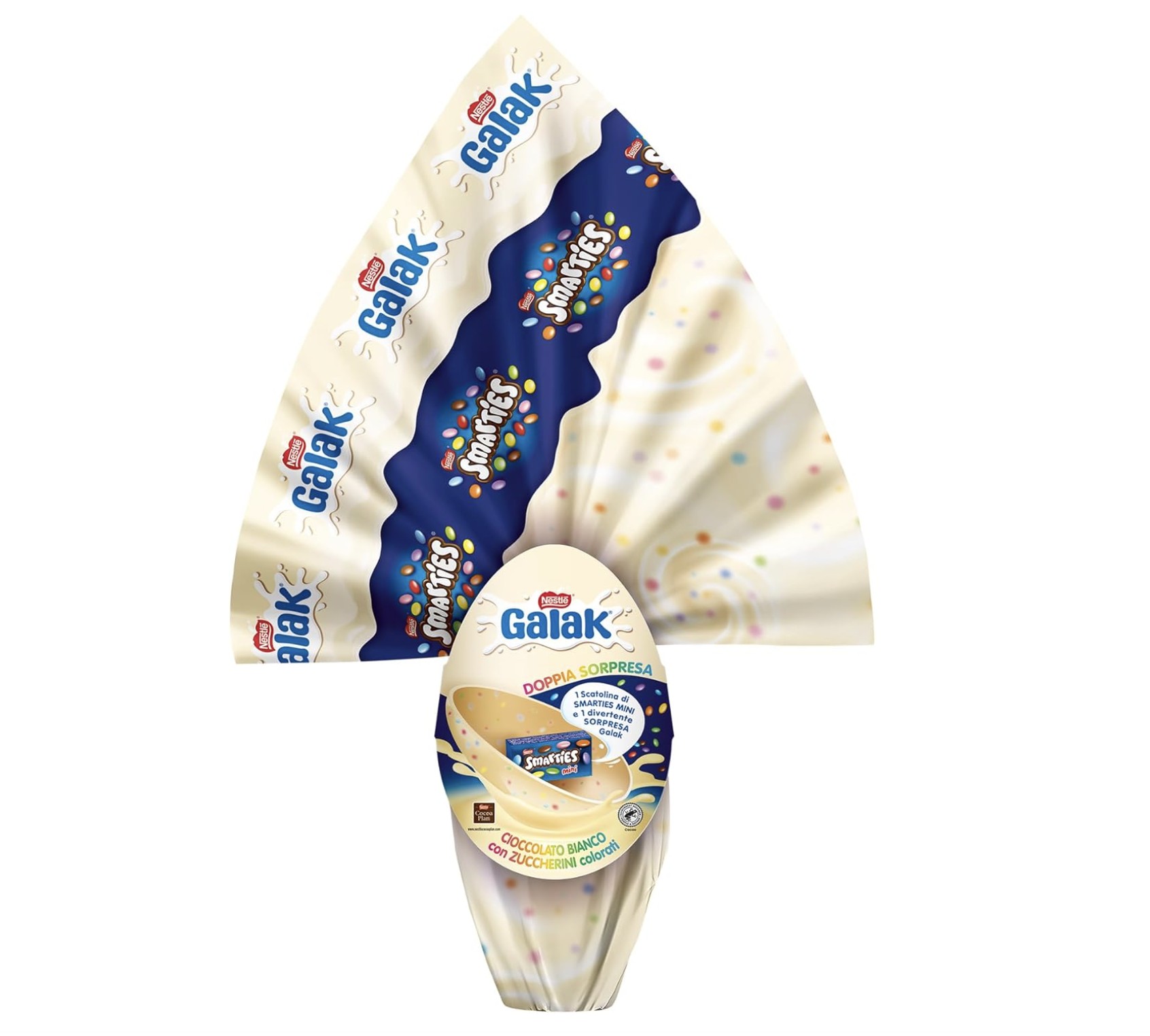 GALAK con SMARTIES Uovo di Pasqua 2025 Cioccolato Bianco con Sorpresa e Mini Smarties 240g