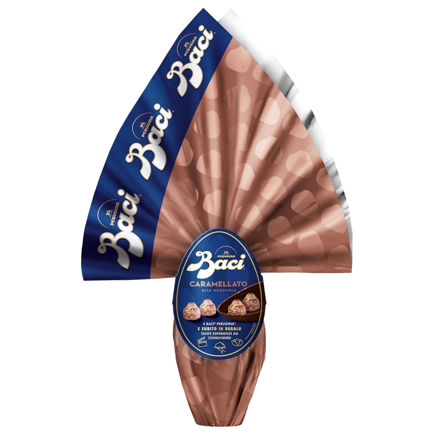 BACI PERUGINA Uovo di Pasqua 2025 Cioccolato Caramellato alle Mandorle con Sorpresa e 4 Cioccolatini 265g