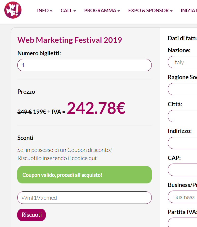 Otterrai così il biglietto per la 3 giorni del Web Marketing Festival 2019 al prezzo unico di 199€+IVA, anziché di 249€+IVA!