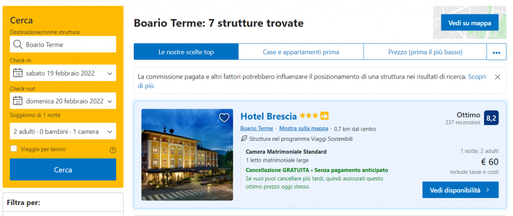 Qui sopra è evidenziato il prezzo per la camera matrimoniale standard (con cancellazione gratuita), ma entrando nell’offerta possiamo vedere anche il prezzo per la Suite, con la colazione inclusa!