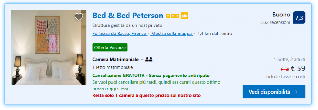 Essendo a due passi dalla stazione, il B&B è vicino a tutte le zone nevralgiche del centro, compreso il duomo! Inoltre, con camere che partono da 25€ a persona, offre prezzi imbattibili per la città di Firenze!