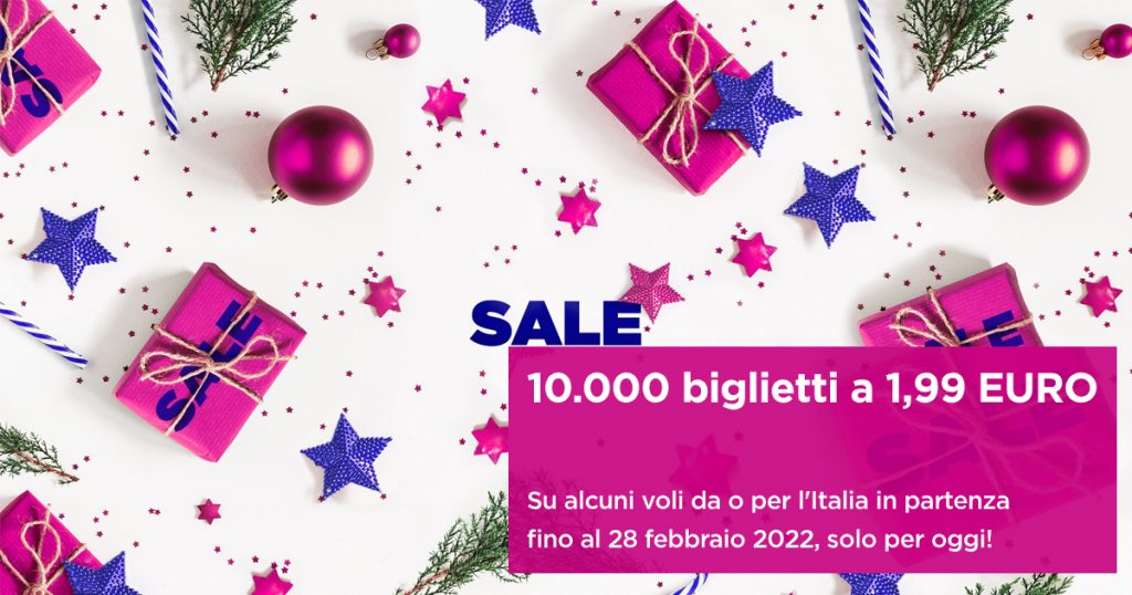 L’offerta è valida fino alla mezzanotte di oggi 10 dicembre su 10.000 voli da o per l’Italia con partenza fino al 28 febbraio 2022.